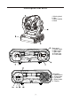 4.Description of the device 1 - Moving head 2 - Yoke 3- Carry handles 4 - Base Rear panel: 5 -Power switch 6 -DMX output 7- DMX input 8- Power cord 9- Fuse holder LAMP:MSD 250/2 MSD 250 SERIAL DATA LINK OUT DMX IN 1=GND 2=SIG.3=SIG.+ POWER SWITCH FUSE LIGHTING CONTROL PROTOCOL:DMX512 Serial number: POWER SUPPLY T 3.15A@230V T 6.