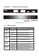 Chapter 3 Physical Description SP3508A front view SP3508A rear view 3.1 LED Definition LED Status PWR (Power LED) Steady/Green Device is powering on or reset ok. POST (Power On Self Testing) Steady/Green Lights on when device is booting. Off Turns off when booting is finished. 10/ACT (Ethernet LED) Steady/Green Flash/Green 100/ACT (Ethernet LED) Steady/Green 1000/ACT (Ethernet LED) Steady/Green Flash/Green Flash/Green Operation Lights up steadily to show good linkage.