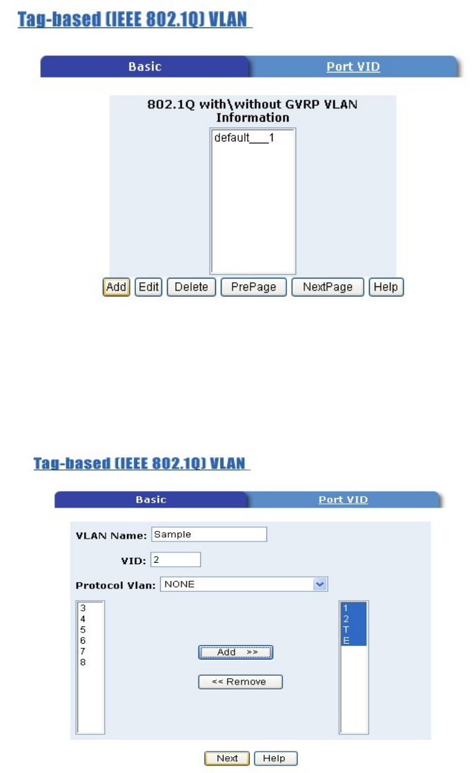 7. Fill in new group name into VLAN Name. Set the VID number. Add in new