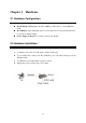 Chapter 2 Hardware 2.1 Hardware Configuration RJ-45 Ethernet Connector – Provides 10 Mbps connectivity to a wired Ethernet LAN. Reset Button – By holding this down for more than five seconds, the unit will reset to its factory default settings. Power Supply Connector – Connects to the power adapter. 2.2 Hardware Installation A. B. C. D. Configure your notebook or PC with a wireless LAN card. For a wired LAN, connect your PC’s Ethernet port to the unit’s LAN port via an Ethernet cable.