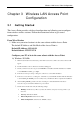 Wireless LAN Access Point Configuration Chapter 3 Wireless LAN Access Point Configuration 3.1 Getting Started This Access Point provides web-based configuration tool allowing you to configure from wired or wireless stations. Follow the instructions below to get started configuration. From Wired Station 1. Make sure your wired station is in the same subnet with the Access Point. The default IP Address and Sub Mask of the Access Point is: Default IP Address: 192.168.2.1 Default Subnet: 255.255.255.