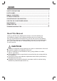 CONTENTS SAFETY PRECAUTIONS ....................................................................................... 1 PARTS NAMES ..................................................................................................... 4 MANUAL OPERATION ......................................................................................... 5 OPTIMAL OPERATION ........................................................................................ 5 ADJUSTING AIR FLOW DIRECTION................................