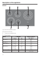 Description of the appliance KM 5840 acd Two-zone variable burners b One-zone burner e Control panel C Diameter Burner inches cm Output in watts at 208 / 240 V Left front a 7 1/16" 9 1/16" 18 23 1600 2500 Left rear b 5 11/16" 14.