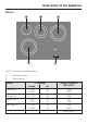 Description of the appliance KM 5860 ac Two-zone variable burners be One-zone burners d Three-zone variable burner f Control panel Burner Left front a Left rear b Center rear c Right rear d Center front e 10 C Diameter inches 7 1/16" 9 1/16" 5 11/16" 4 3/4" 7 1/16" 5 11/16" 8 1/4" 10 5/8" 5 11/16" cm 18 23 14.5 12 18 14.5 21 27 14.