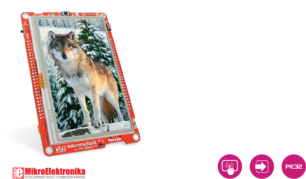 mikromedia+ for PIC32MX7® Amazingly compact, all-on-single-pcb development board carring 4.3’’ TFT Touch Screen and lots of multimedia peripherals, all driven by powerful PIC32MX795F512L microcontroller.