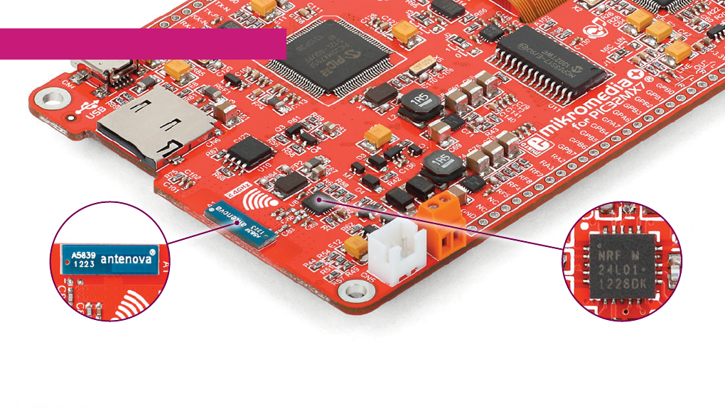 board features RF transceiver chip with 2.4GHz chip antenna. It is suitable for wireless operation