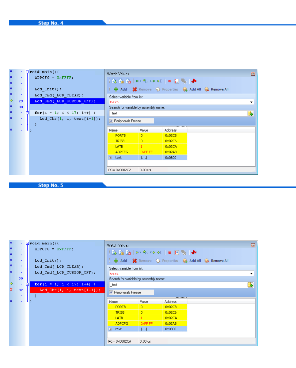 “mikroElektronika” on Lcd char by char. Breakpoint is set on Lcd_Chr and the program will stop every time this function