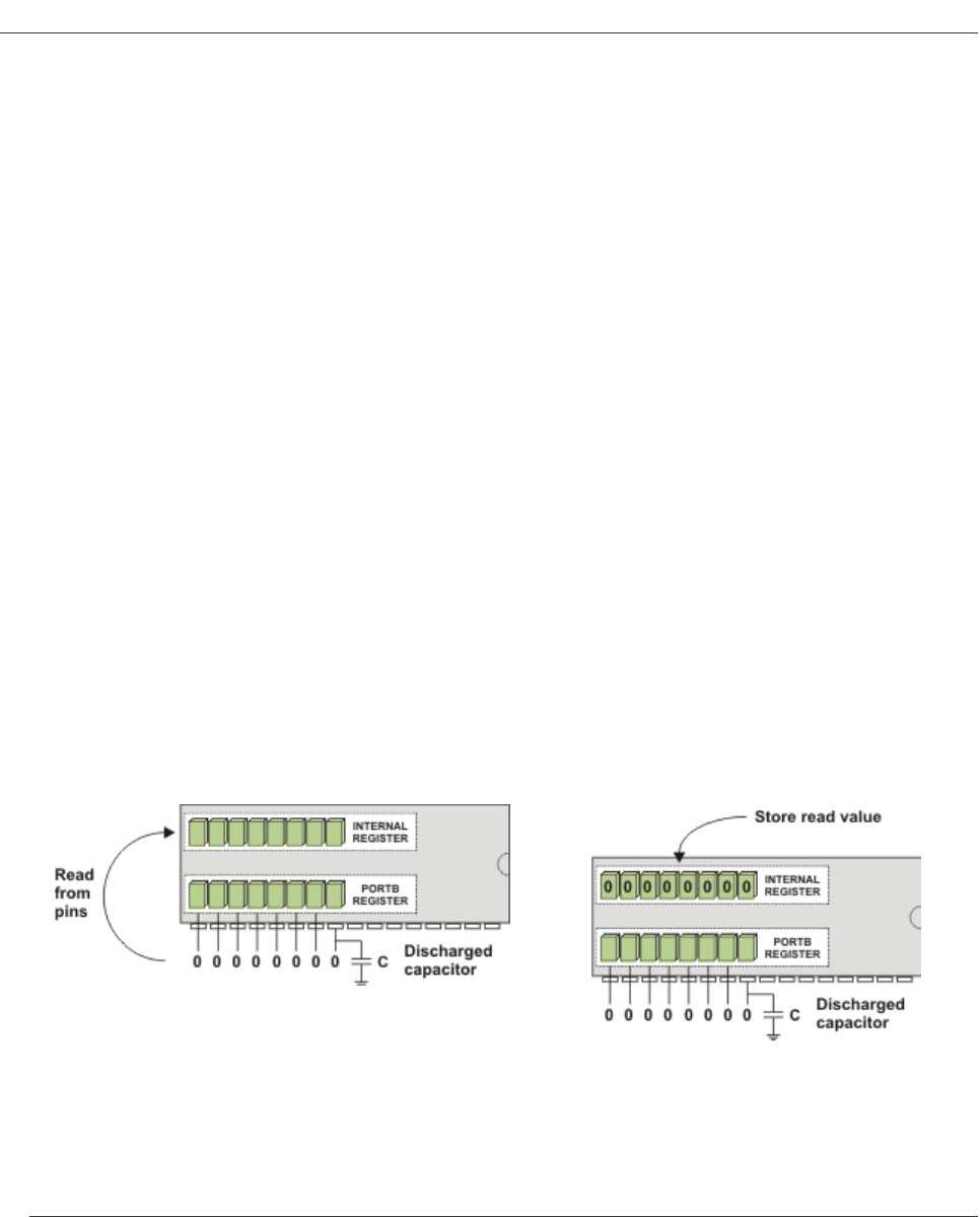 Assume that the PORTB is initially set to zero, and that all pins are set to output. Let’s say we connect a discharged