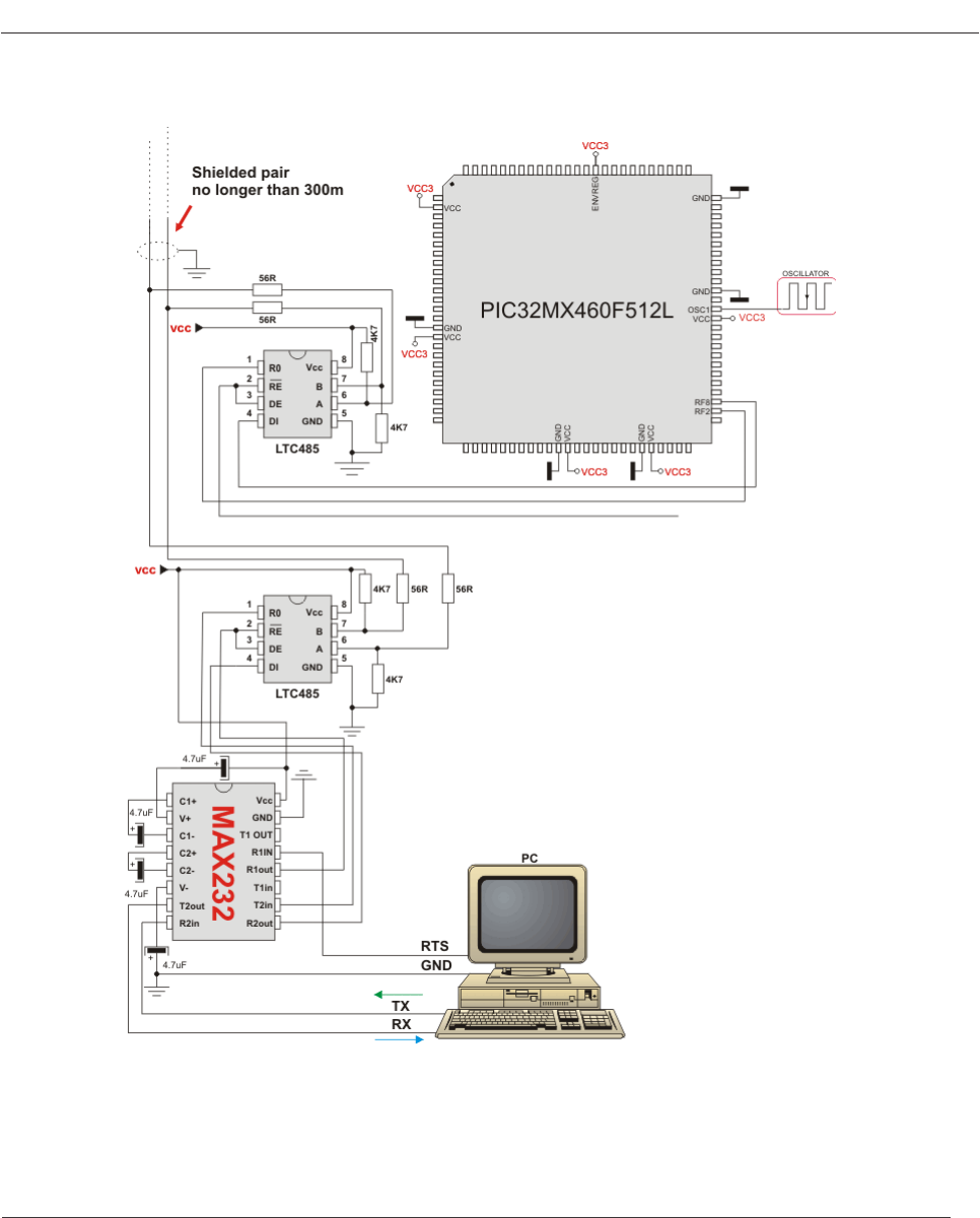 Example of interfacing PC to PIC32 MCU via RS485 bus with LTC485 as RS-485 transceiver