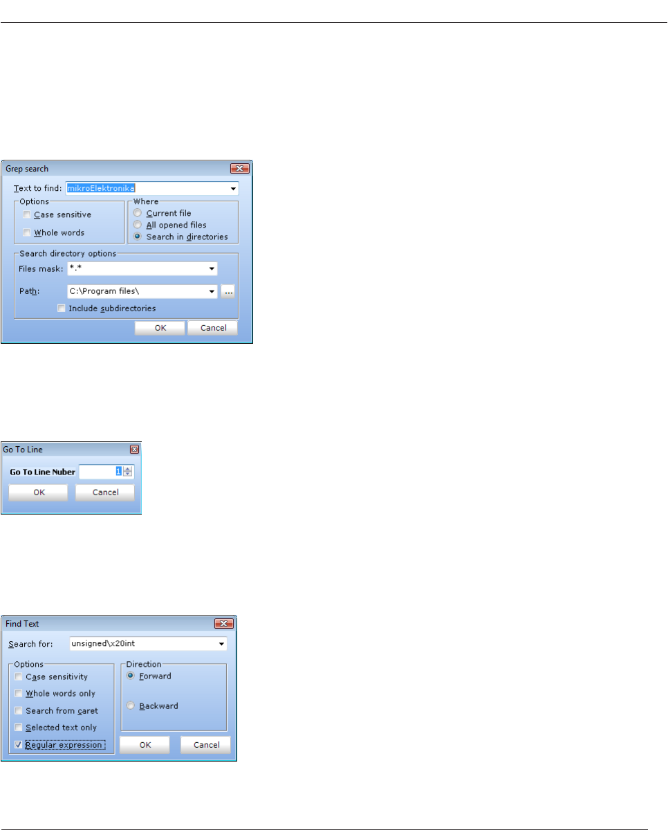 Dialog box for searching for a text string in current le, all opened les, or in les on a disk.