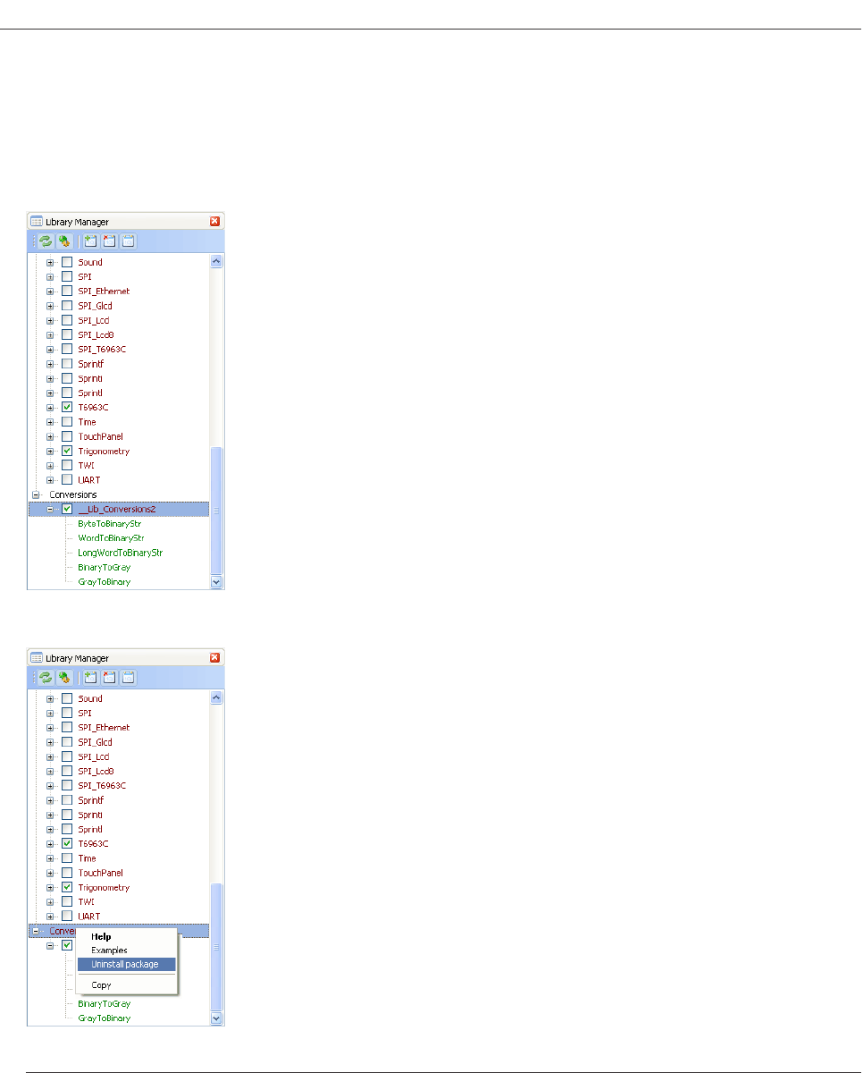 From the Library Manager, the user can also uninstall the desired package by right clicking the the appropriate node,