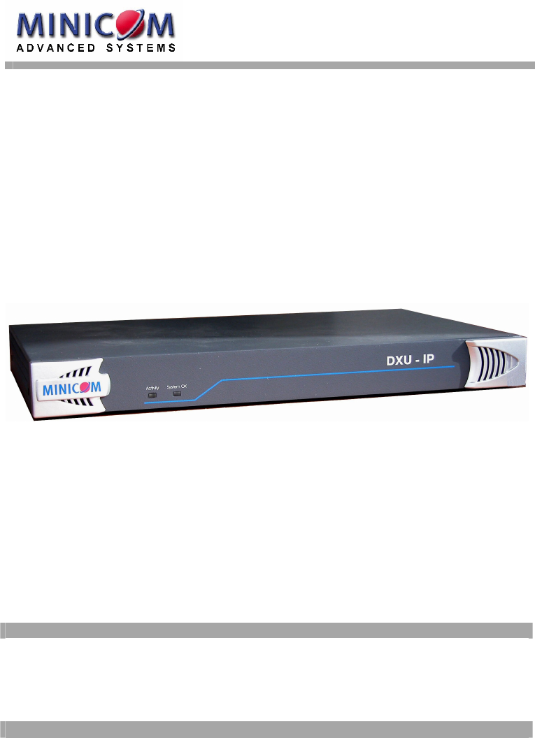 DX User IP User Guide w w w . m i n i c o m . c o m International HQ North American HQ European HQ Jerusalem, Israel Linden, NJ, USA Tel: + 972 2 535 9666 minicom@minicom.com Tel: + 1 908 4862100 info.usa@minicom.com Dübendorf, Switzerland Tel: + 41 44 823 8000 info.europe@minicom.com Customer support - support@minicom.com 5UM20140 V1.