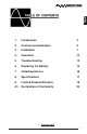 English 1. Introduction 2 2. Controls and Indicators 6 3. Installation 7 4. Operation 10 5. Troubleshooting 12 6. Replacing the Battery 13 7. Obtaining Service 16 8. Specifications 17 9. Limited Product Warranty 19 A1.