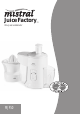 Your Mistral Juice Factory Citrus Juicer & Extractor Congratulations on the purchase of your new Mistral Juice Factory. Before first using your new Mistral Juice Factory please take a few minutes to read this Use & Care booklet and then find a place to keep it handy for future reference. Your attention is drawn particularly to the section dealing with ‘Important Safeguards’. This appliance has been designed to operate from a standard domestic power outlet.