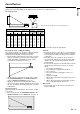 Installation ENGLISH Layout of the projector Image size varies depending on the distance between the screen and the projector. Front projection W B H A A=B L L Diagonal size inch cm Screen Width : W inch cm Height : H inch cm : Between the screen and the front edge of the projector Distance from the screen : L Maximum Minimum zoom (WIDE) zoom (TELE) inch m inch m 40 102 35 89 20 50 50 1.3 60 1.5 60 152 52 133 29 75 76 1.9 92 2.3 80 203 70 177 39 100 102 2.6 123 3.