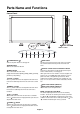 Parts Name and Functions Control Panel 9 10 OFF ON 11 Button Location EXIT 8 POWER button ( 7 6 5 INPUT MUTE 3 2 4 ) 1 EXIT button Switches the power on/off. See also page 18. Activates the OSD menu when the OSD menu is turned-off. Acts as EXIT button to move to previous menu with OSD menu. MUTE button Switches the audio mute ON/OFF. Remote control sensor and Power indicator INPUT button Acts as SET button with OSD menu.
