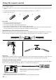 Using the remote control Battery installation Use two AA size batteries. 1. Remove the back cover of the remote control by pushing the battery compartment door in the direction of the arrow. 2. Load the batteries making sure that they are positioned correctly (+ to +, and - to -). 3. Replace the back cover. 1 2 3 Important: • Do not use a new battery with an old one. • Load batteries in the correct position. • Do not heat, take apart, or throw batteries into fire. • Do not try to recharge batteries.