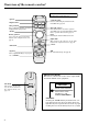 Overview of the remote control The buttons with *mark work as same as the buttons on the projector. POWER * power card auto play RGB VIDEO PC CARD AUTO POSITION RELEASE AUTOPLAY * input source Press to start auto play function of the PC CARD. See page 24. auto position Use to adjust the position of Personal computer image. See page 16. * menu PC card release LASER MENU Press this button to be able to eject PC card. Make sure to press this button all the time to eject the PC card. See page 23.