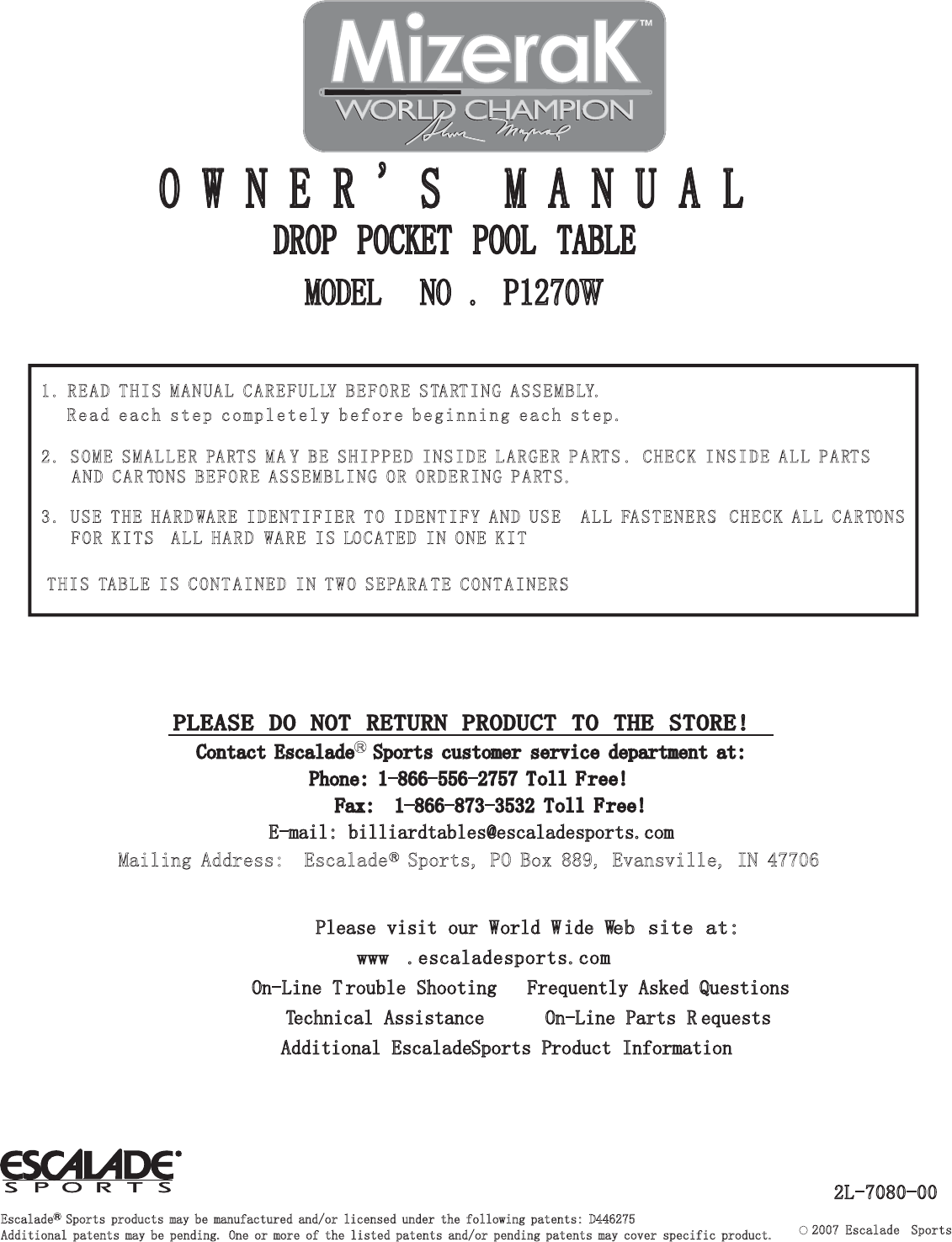 Mailing Address: Escalade Sports, PO Box 889, Evansville, IN 47706
