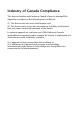 Industry of Canada Compliance This device complies with Industry Canada’s licence-exempt RSSs. Operation is subject to the following two conditions: (1) This device may not cause interference; and (2) This device must accept any interference, including interference that may cause undesired operation of the device. Le présent appareil est conforme aux CNR d’Industrie Canada applicables aux appareils radio exempts de licence.