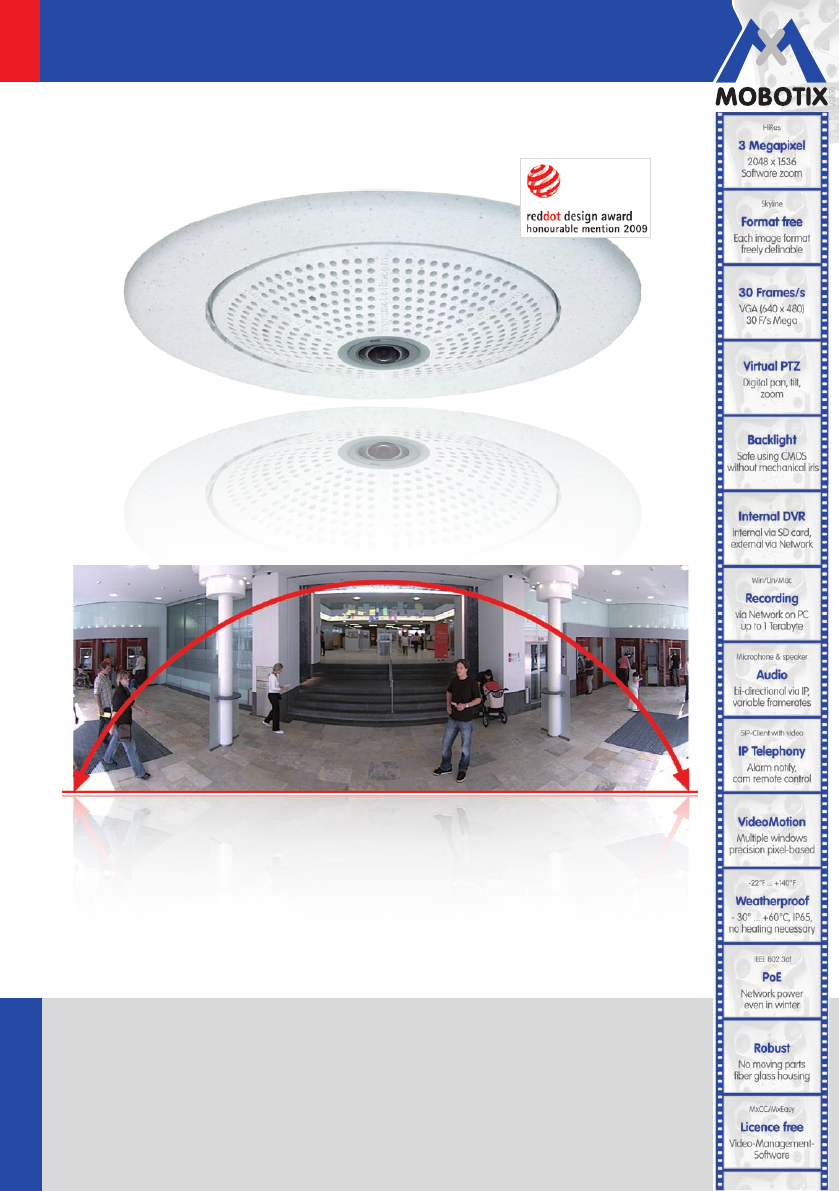 /��� 156 Q24M Camera Manual: Added Security Value Added SECURITY VALUE Q24M Panorama: one camera - three simultaneous views high-resolution 180° Panorama Robust, Low-Maintenance Technology The real added value of MOBOTIX products is reflected in characteristics such as enhanced functionality, long life and robustness. MOBOTIX cameras basically have no moving parts. This makes the cameras very resistant to wear and tear, and reduces both maintenance costs and power consumption.
