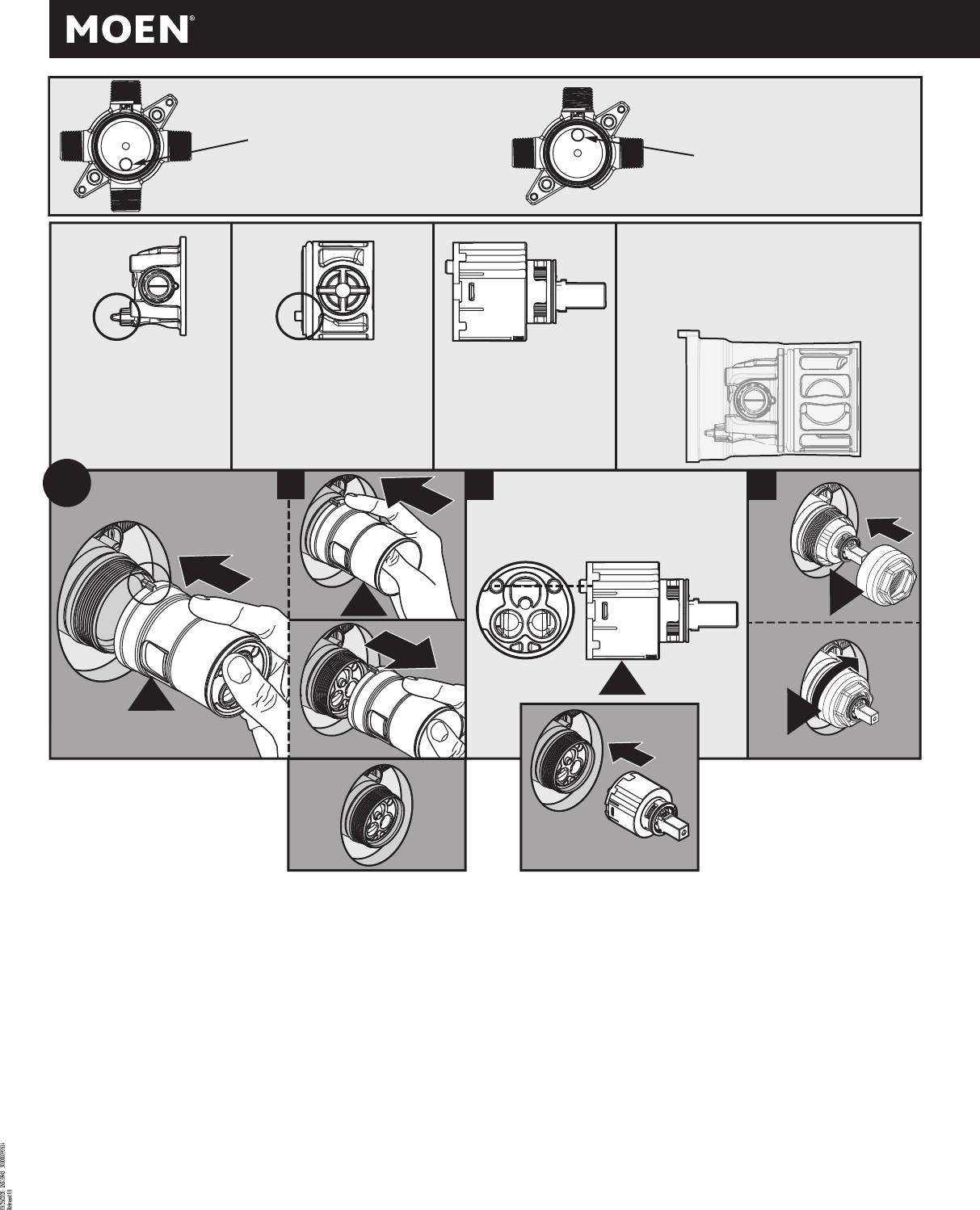 1. Align tab on Installation sleeve (E) facing up and place in line with valve. Push Adapter (E1) and pressure balance puck (E2) out of the installation sleeve (E3) into the valve until they bottom.