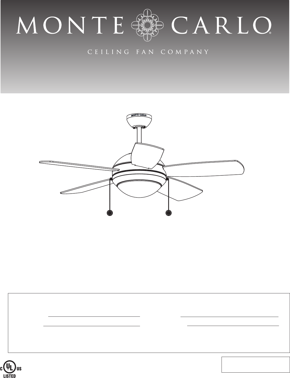 Owner’s Guide and Installation Manual 5DIC44XXXD Series Fan UL Model NO. : 5DIC44XXXD Attach sales receipt to this card and retain as your proof of purchase DATE OF PURCHASE: RETAILER NAME: MODEL NUMBER: RETAILER ADDRESS: To register your fixture, please visit our website www.montecarlofans.com 7.9 kgs 17.