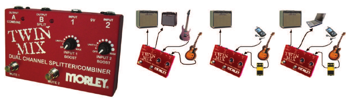 The Twin Mix powers up from one 9V battery or optional Morley® 9V 300mA adapter