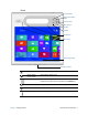 Microphones Records sounds and used for speech recognition. Web camera (optional) Use for web-based video communication. Touchscreen display Use your finger or pen to navigate the tablet. Docking connector Connects to a C5te/F5te docking station. Right side Windows® security button Power adapter port, USB 2.0/3.