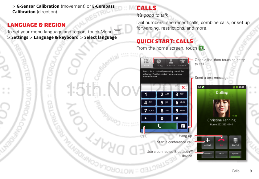 > G-Sensor Calibration (movement) or E-Compass Calibration (direction). Language & region To set your menu language and region, touch Menu > Settings > Language & keyboard > Select language Calls it’s good to talk Dial numbers, see recent calls, combine calls, or set up forwarding, restrictions, and more. Quick start: Calls From the home screen, touch Phone Call log Contacts Favorites Search for a contact by entering one of the following: First letter(s) of name, name or phone number 15th.