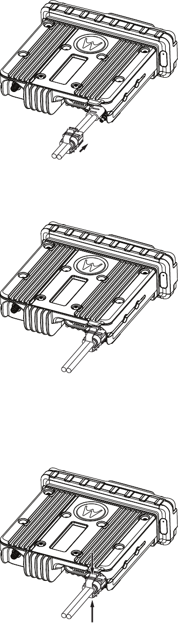 MN005720A01-AB Chapter 2: Standard Configurations Figure 67: Mini-UHF Connection 1 2 3 5 6 4 No. Description 1 Coax Conductor Plug (Pin) 2 Collar Pulled Back to Flange 3 Flange 4 Cable 5 Mini UHF Jack 6 RF Antenna Connector Label 2.4.3.1 Installing Mini-UHF Connection Prerequisites: • Ensure that there is sufficient slack in the antenna cable. • Ensure that the collar of the antenna cable plug is loose and does not bind. • Ensure that the mini-UHF jack is tight in the radio housing.