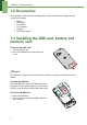 Chapter 1: Getting started 1.2 Accessories Your package comes with the following items. If any of these are missing, please contact your retailer. • • • • • • Phone USB cable AC adaptor Li-Ion battery Headset Quick start guide 1.3 Installing the SIM card, battery and memory card To remove the back cover 1. Turn the device off. 2. Push and slide down to open the back cover. 2 1 SIM card The SIM card contains your phone number, memory storage and network service details.