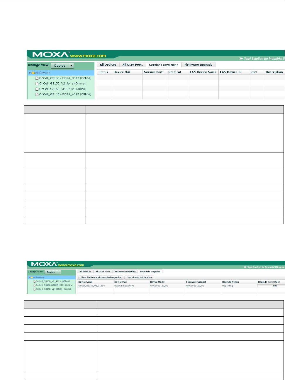 The Service Forwarding table displays the host’s established Ethernet connection to the OnCell Central