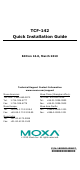 TCF-142 Quick Installation Guide Edition 16.0, March 2019 Technical Support Contact Information www.moxa.com/support Moxa Americas: Toll-free: 1-888-669-2872 Tel: 1-714-528-6777 Fax: 1-714-528-6778 Moxa China (Shanghai office): Toll-free: 800-820-5036 Tel: +86-21-5258-9955 Fax: +86-21-5258-5505 Moxa Europe: Tel: +49-89-3 70 03 99-0 Fax: +49-89-3 70 03 99-99 Moxa Asia-Pacific: Tel: +886-2-8919-1230 Fax: +886-2-8919-1231 Moxa India: Tel: +91-80-4172-9088 Fax: +91-80-4132-1045 2019 Moxa Inc.