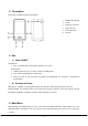 2. Description Here below you will find a product description 1. MICRO SD Card slot 2. Return 3. Earphone connector 4. USB connector 5. Power ON /OFF 6. Camera 3. Use a) Power ON/OFF Powering On:. 1. Turn on On/Off button to On position and power on screen Powering Off: 1. Hold the Return key for 4 seconds to switch to standby mode. 2. Then, turn the On/Off button to Off position. 3. Under the state of stop, the player may power off automatically if a sleep time is predefined in System Menu.