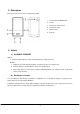 2. Description Ci-dessous vous trouverez une description du produit 1. Fente pour Carte MICRO SD 2. Retour 3. Connecteur de l’écouteur 4. Connecteur USB 5. Marche/ Arrêt 6. Camera 3. Utiliser a) ALLUMER/ ETEINDRE Allumer: 1. Mettez le bouton Marche / Arrêt en position Marche et allumez l’écran Eteindre : 1. Maintenez la touche Retour pendant 4 secondes pour passer en mode veille. 2. Ensuite, Mettez le bouton Marche / Arrêt sur la position Arrêt. 3.