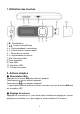 1. Définition des touches 1. M : Touche Menu : Touche Lecture/Pause 2. 3. < : Piste précédente / rembobiner 4. > : Piste suivante / avance rapide 5. - : Diminution du volume 6. + : Augmentation du volume 7. M/A: Interrupteur M/A. 8. Prise écouteurs 9. Prise USB 10. Capuchon USB 11. Trou pour le cordon 2.