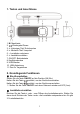 1. Tasten und Anschlüsse 1. M: Menütaste : Wiedergabe/Pause 2. 3. <: Vorheriger Titel/ Zurückspulen 4. >: Nächster Titel/ Vorspulen 5. -: Lautstärke reduzieren 6. +: Lautstärke erhöhen 7. ON/OFF: Betriebstaste 8. Kopfhörerbuchse 9. USB-Stecker 10. USB-Abdeckung 11. Öse für Trageriemen 2. Grundlegende Funktionen ● Ein-/Ausschalten Stellen Sie die Taste ON/OFF auf die Position ON (Ein): gedrückt, um das Gerät einzuschalten. Halten Sie die Taste gedrückt, um das Gerät auszuschalten.