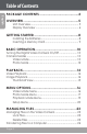 Table of Contents English Package Contents............................................4 Overview..............................................................5 Unit Overview.................................................................... 5 Display Overview............................................................. 6 Getting Started..................................................8 Installing the Batteries..................................................... 8 Inserting a Memory Card..............