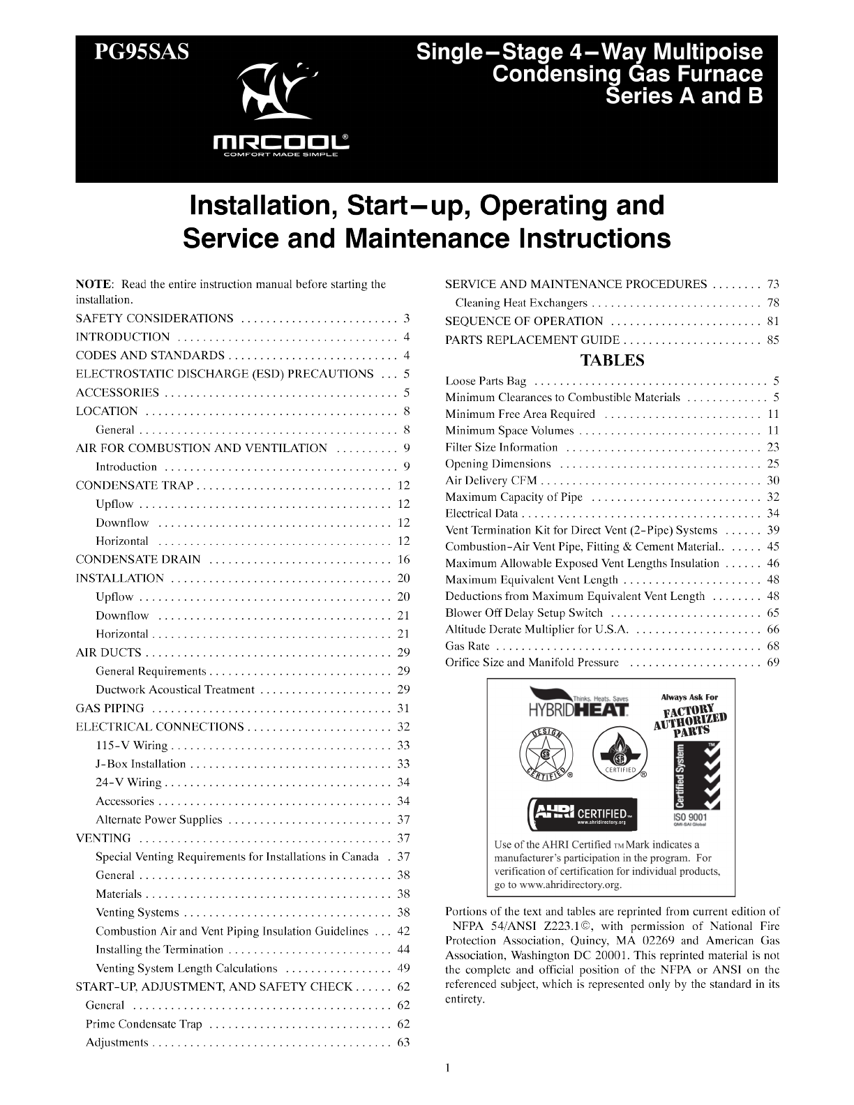 A12267 PG95SAS FURNACE SIZE 24026 30040 42060 48080 60080 42100 60100 60120 60140 A CABINET WIDTH B OUTLET WIDTH C BOTTOM INLET WIDTH D AIR INTAKE 14--- 3/16 (361) 12--- 1/2 (319) 12--- 9/16 (322) 7--- 1/8 (181) 17--- 1/2 (445) 15--- 7/8 (403) 16 (406) 8--- 3/4 (222) 21 (533) 19--- 3/8 (492) 19--- 1/2 (495) 10--- 1/2 (267) 24--- 1/2 (622) 22--- 7/8 (581) 23 (584) 12--- 1/4 (311) Fig. 1 -- Dimensional Drawing 6 SHIP WT. LB (KG) 118.0 (53.5) 123.0 (55.4) 144.0 (64.8) 154.0 (69.3) 161.