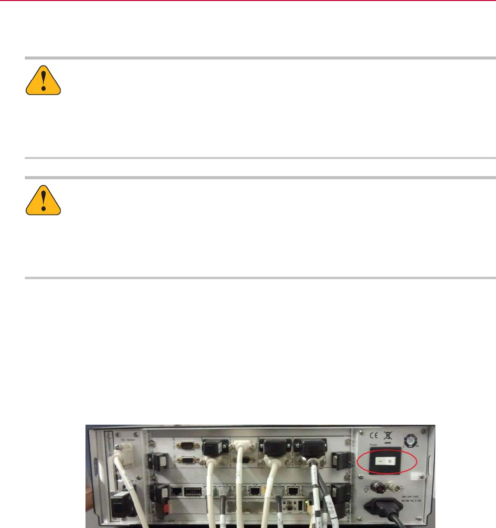 The main power switch for the MTS Acumen load frame is located on the back side of the load frame base.