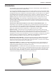 Chapter 1 - Introduction Specifications Hardware ARM RISC CPU 32 bit, 40MHZ 4MB DRAM and 512k Flash ROM UART Serial port controller LAN Port Interface: 1 10Base-T/100BaseTX RJ-45 Connection Standard: 802.3 WAN Ports 1 x 10Base-T 1 x RS232 (V.24) DTE Speed: Up to 230K asynchronous Wireless Access Point Protocols IEEE 802.11b for wireless LAN Date Rates: 11, 5.5, 2, 1 Mbps data rate per channel RF Frequency: 2.4-.