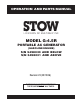 STOW G-4.5R — SPECIFICATIONS Table 1. Specifications MODEL Type Frequency (Hz) GENERATOR G-4.5R 2-Pole, Brushless Type Revolving Field 60 Continuous Output (kW) 3.70 Maximum Output (kW) 4.5 Voltages (VAC) 120/240 Max/Continuous Amps 120 VAC 37.5/30.8 Max/Continuous Amps 240 VAC 18.75/15.4 Rated Speed (RPM) Power Factor Dimension (L x W x H) in. (mm) Dry Net Weight lbs. (kg) Includes Engine 3600 1.0 23 X 18.5 X 20.