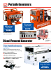 Portable Generators 9700 watts max. Honda engine Recoil/Electric start 6000 watts max. Honda engine Recoil/Electric start GA97HE GA6HEA Also available with Robin engine as Model GA6REA Diesel Powered Generator Unit shown on optional WKT97 Wheel Kit Delivers dependable performance for a variety of industrial and commercial applications. Compact, sound-attenuated package with full instrumentation, including hour meter and warning lights for oil, water and battery.