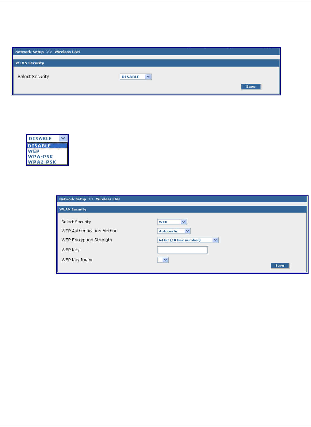 Select the Security option from the drop down box for the Wireless LAN network. Each selection will