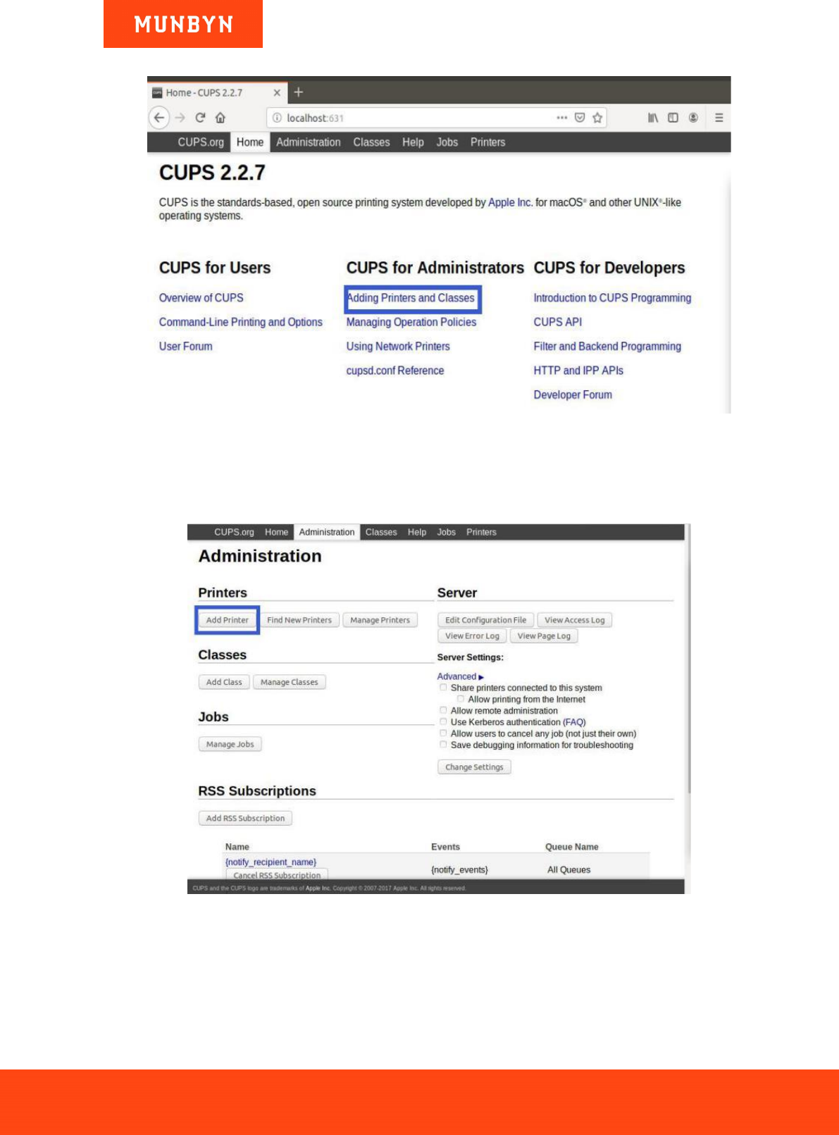 3) Open cups at localhost: 631 in your browser and choose "Adding Printers and Classes" .