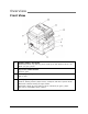 Overview Front View 1. Output stacker, face down Standard printed copy delivery point. Holds up to 150 sheets of 20-lb. US Bond (75 g/m²) paper. 2. Top cover release button Press to open. 3. Multi purpose tray release handle Pull to open. 4. Multi purpose tray Used for feeding heavier paper stocks, envelopes and other special media. MFX-3070: Manual feeding of single sheets. MFX-3090: Holds up to 50 sheets of 20-lb. US Bond (75 g/m²) paper. Also has an extendable paper support.
