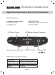 PORTABLE POWER PACK Operation Instructions & Further Information Product Features: • Magnetic Mounting Pads • DC Power Outlet • Charging Port • ON/OFF Switch • LED Battery Capacity Indicator • Rated to IP66 LED Battery Capacity Indicator DC Power Outlet Magnetic Mounting Pads ON/OFF Switch LED Battery Capacity Indicator LED Indicator 1 LED 2 LED’s 3 LED’s 4 LED’s Remaining Battery Capacity 10-25 % 25-50 % 50-75 % 75-100 % page 4 Charging Port