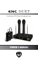 SPECIFICATIONS ENC-DUET OVERALL SYSTEM PERFORMANCE Frequency Response 25-20,000 Hz, +/-3dB Dynamic Range 120dB Total Harmonic Distortion < 0.3% RF Carrier Frequency Range 2 channels between 169-216 MHz Frequency Stability +/- 0.005%, crystal controlled Modulation FM (F3E), +/-20KHz max. Operating Range Up to 250 ft. typical (depending on site conditions); up to 500+ feet optimum line-of-sight ENC-DUET RECEIVER Reception Mode Controls Connectors LED Indicators Dimensions (Max.