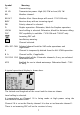 Symbol Meaning TX Transmitting. HI LO Transmission power. High (HI) 25W or Low (LO) 1W. WX Weather channel. WX ALT Weather Alert. Alarm beeps will sound. 7100 USA only. BUSY Receiver busy with an incoming signal. PRI Priority channel is selected. D Duplex operation. Otherwise, blank for Simplex operation. LOCAL Local calling is selected. Otherwise, blank for distance calling. DSC DSC capability is available. 7100 USA and 7100 EC only. Incoming DSC call. Low Battery warning.
